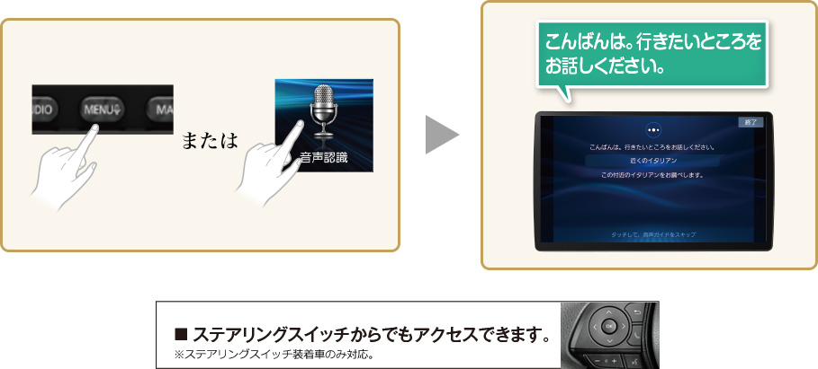「MENU」ボタンの長押し、または「音声認識ボタン」を押せばすぐに利用できます。専用アプリを立ち上げる必要はありません。